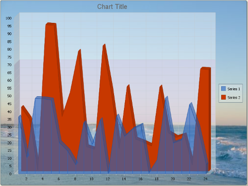 This sample illustrates the effect of color transparency in a fairly complex 3D chart. We used several Chart FX features to create a chart with a background image, axis sections and other elements that take a color setting. With the controls dsiplayed below, you can set the transparency setting for each of these elements and see its effect in the chart.